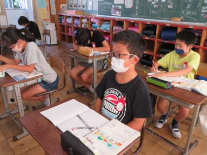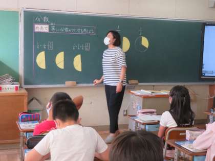 「分数」で、等しい分数のつくり方を考えました。黒板の図を見ながら、真剣に学習に取り組みました。