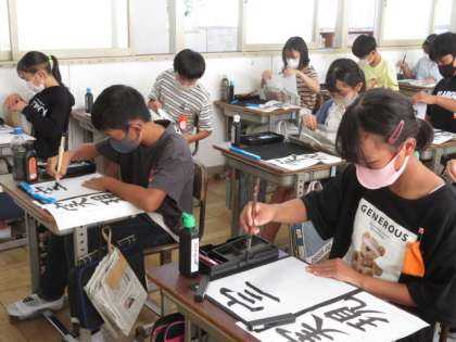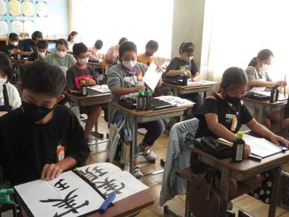 左右の組み立て方と点画のつながりに気を付けて「実現」を書きました。姿勢よく集中して書くことができました。