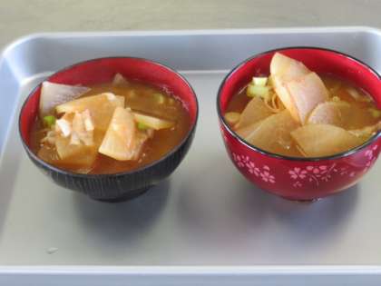 「おいしいみそ汁を作ろう」で、友だちと協力してみそ汁を作りました。じょうずに作ることができ、おいしそうでした。