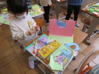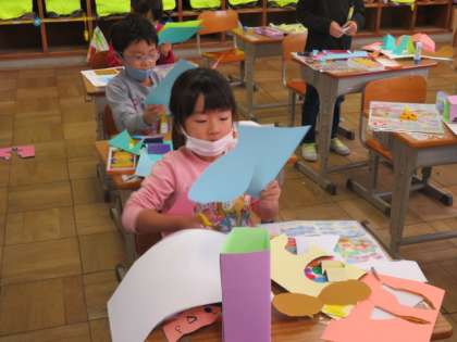 パステルカラーペーパーを折ったり、丸めたり、箱にしたりしました。海の生き物の場面など工夫して作り上げました。