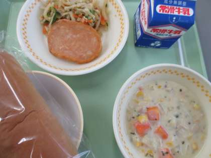 ・牛乳 ・くろロールパン ・チキンハムステーキ