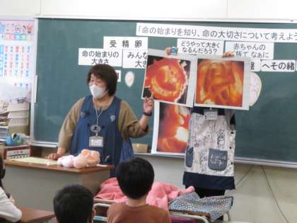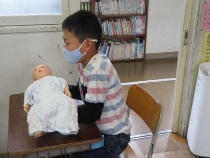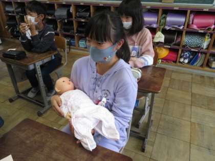 命の始まりを知り、命の大切さについて考えました。実際に、体重3キログラムの赤ちゃん人形を抱いてみました。