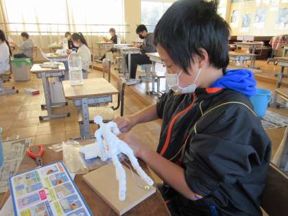 針金の骨組に、紙粘土で、肉付けをしていきます。