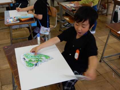 図工です。「ふしぎな たまご」の製作です。卵の模様を描いて、割れた卵から何が出てくるかを表現します。色とりどりの卵がたくさん描けました。