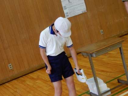これは、握力、握りしめる力を測定します。大きな声で気合を入れながら、腕に力を入れています。
