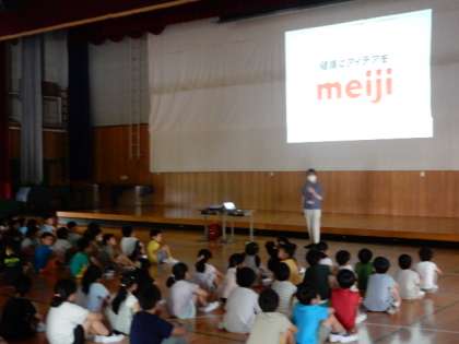 2時間目に1・2・3年生の学校保健委員会を行いました。株式会社明治から講師をお招きし「すすんで運動、しっかり食べよう」を演題に、バランスのとれた食事と適度な運動が成長には大切ということを低学年にもわかりやすく教えていただきました。