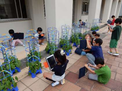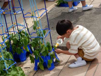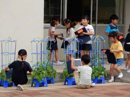 生活科です。「わたしのあさがお」の学習です。アサガオの成長が早く1日ごとにどんどん大きくなっていきます。成長を見逃さないように観察です。水やりも忘れていません。