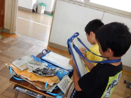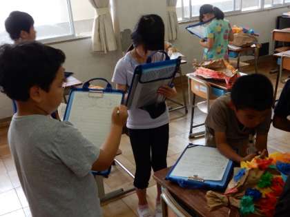 図工です。「くしゃくしゃ ぎゅっ」の学習です。作品が完成しました。今日はお互いの作品を鑑賞し合い、友達の作品のよいところを見つけます。お互いのよいところを吸収し合います。