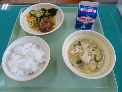・牛乳 ・ごはん ・鶏肉の香味だれかけ ・きゅうりとわかめの酢の物 ・かきたま汁