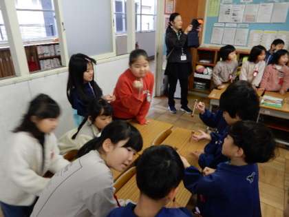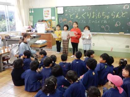 1年生は、南粕谷保育園の子どもたちを招待して交流会を開きました。総合的な学習の「見つけた あきで あそぼう」の学習で作ったおもちゃを紹介してみんなで遊びました。
