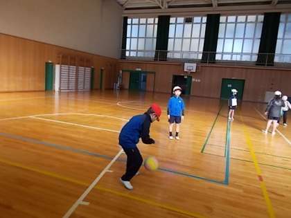 体育です。「ゲーム(ボールゲーム)」の学習です。ボールを扱ったゲームをしていきます。まずは、ドリブルの練習です。ボールの動きに合わせて連続でボールつきます。