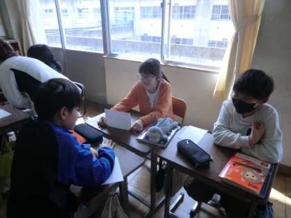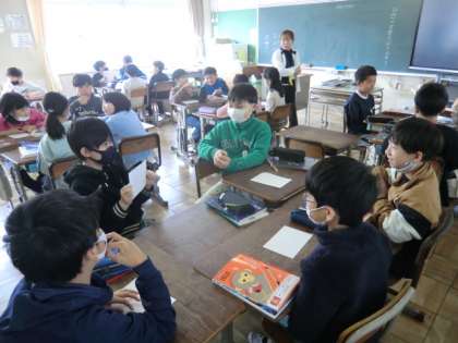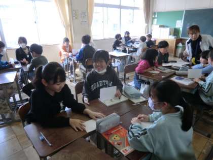 国語です。「言葉のじゅんび運動(ひみつの言葉を引き出そう)」の学習です。ヒントを伝えてカードに書かれた言葉を、友だちに当ててもらいます。どのようなときにその言葉を使うかが鍵になります。