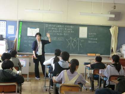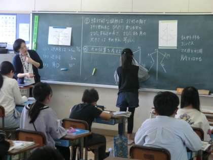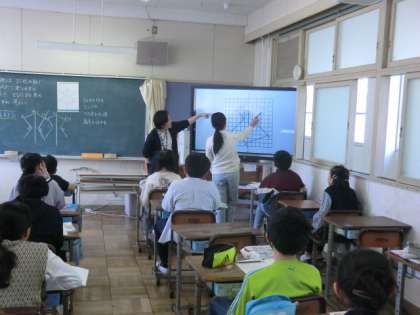 算数です。「対称な図形」の学習です。線対称の図形を作図する練習です。新しい概念の登場に戸惑いも見られますが、一生懸命理解しようとがんばっています。