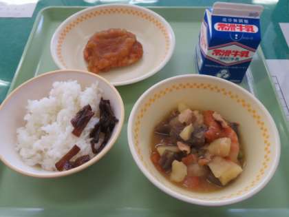 ・牛乳 ・ごはん ・肉じゃが ・豆腐バーグのみぞれかけ ・ふきの佃煮