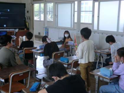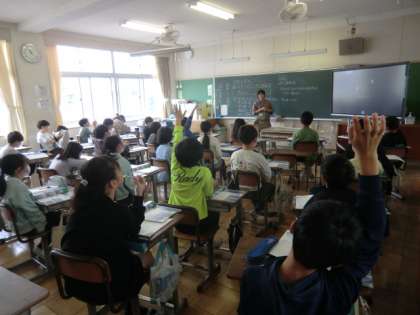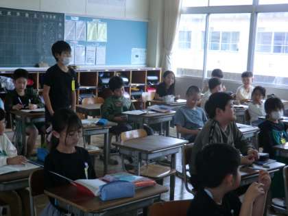 国語です。「楽しく書こう(なりきって書こう)」の学習です。みんながなりきった物になって発表し合っています。友だちのよかったところも発表し合ってお互いを高め合っています。