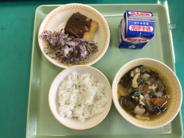ご飯・牛乳・けんちんしのだの肉味噌かけ・キャベツの赤紫蘇和え・実沢山汁