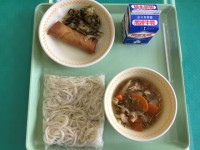 今日の献立ソフト麺・牛乳・ちゃんぽん風かけ汁・春巻き・白菜の昆布和え
