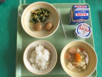 今日の献立ご飯牛乳レバー入りつくね野菜のおかか和え石狩汁ヨーグルト