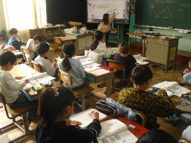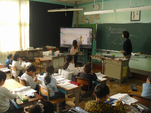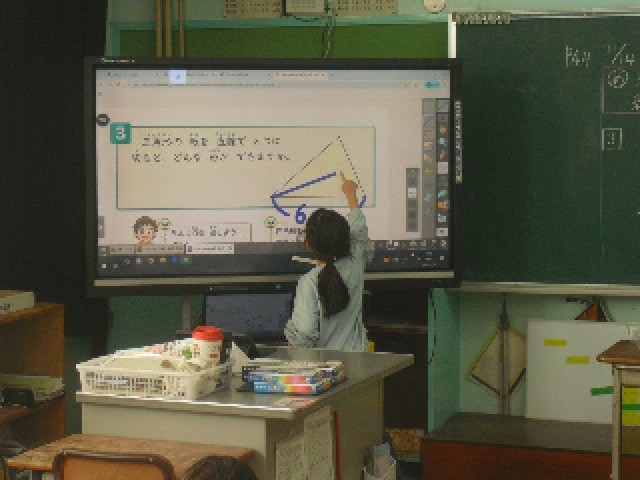 2年生の算数では図形の学習に取り組んでいます。1つの三角形を一本の直線で2つの三角形に分けるきまりを見つけています。