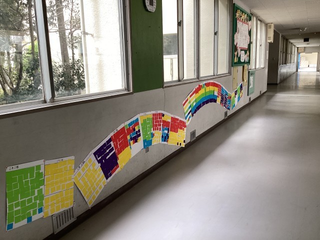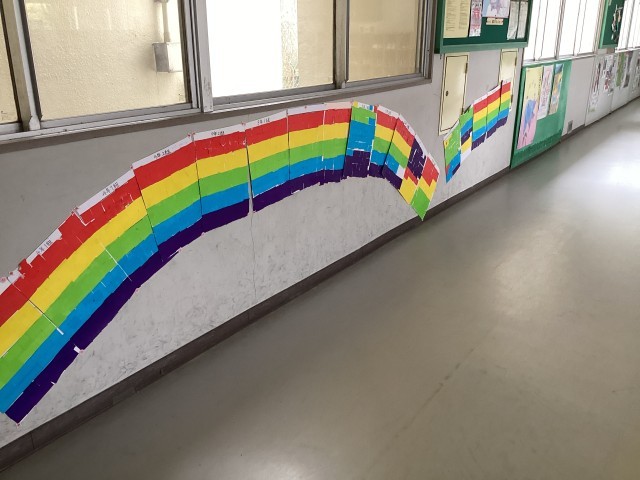児童会が主催したあいさつキャンペーンで、あいさつするとシールがもらえていました。一体、これは何に使われるのだろうと思っていたら、今日その答えが出ました。あいさつの虹ができあがり、昇降口を彩ってくれています。すてきな企画でした。これからも、委員会主催の取り組みが増えていくことを楽しみにしています。