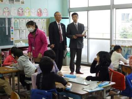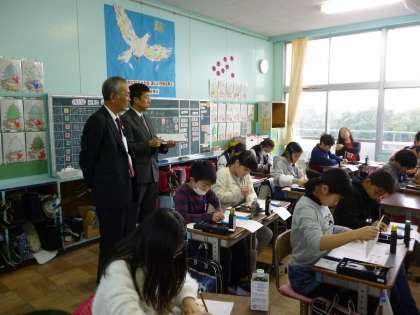 今日は、知多市教育委員会から小宮教育長さんと阿部指導主事さんをお迎えし、学校の様子を見ていただきました。