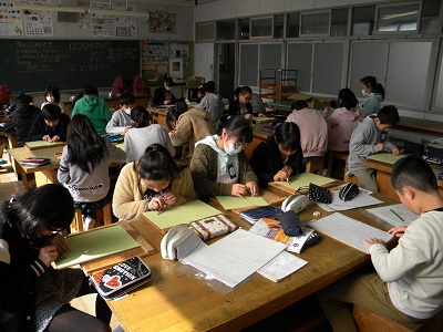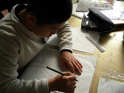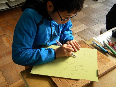今日は、下絵を版に写し、彫刻刀で彫りました。