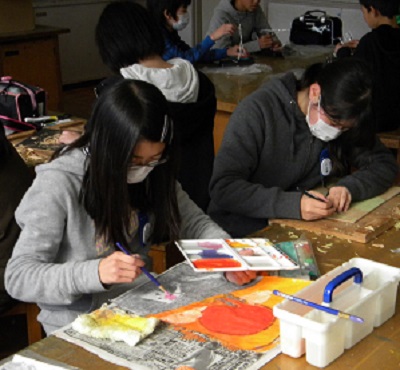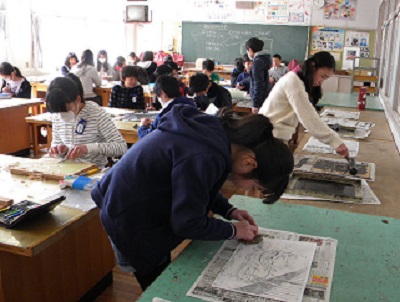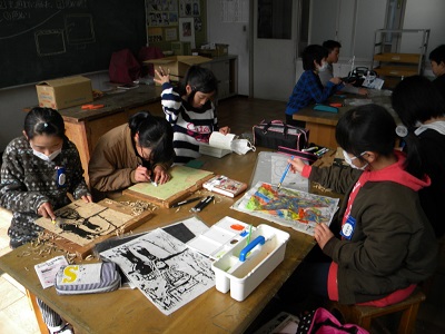 彫った木くずをほうきで集めて掃除したり、余ったインクの処理をしたり、自分の片付けが終わってから、自主的に全体の後片付けをする児童が何人もいて、感心します。