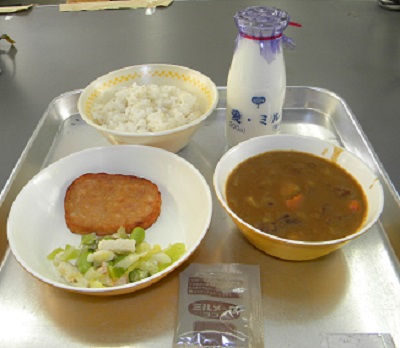 2月9日は「肉の日」です。今日のメニューは、給食としては豪華な「ビーフカレー」です。知多牛を使っています。
