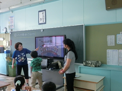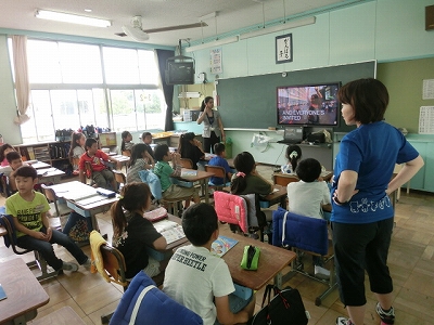 今日は、外国の様子を映像でみたり、外国人の先生(ALT)のネイティブな発音を聞きながら、英語で挨拶の練習をしました。