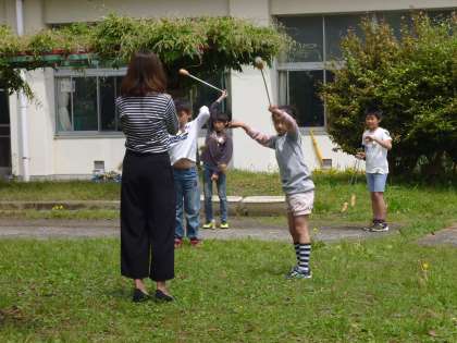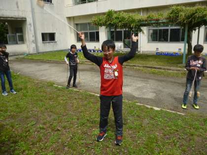 5年生は林間学校でのキャンプファイヤーに向けて、休み時間にトーチワークの練習をしています。