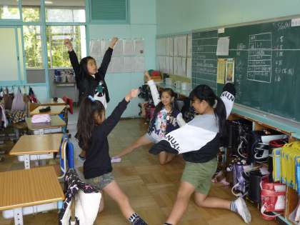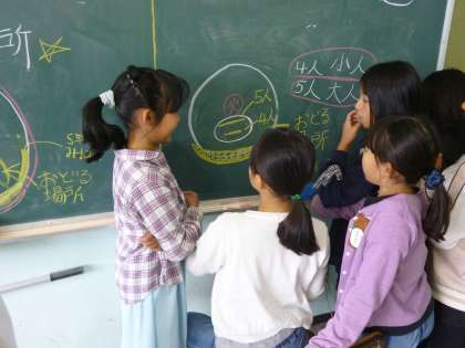 5年生は、総合的な学習の時間を活用して、林間学校で行うスタンツの計画を練り、練習をしています「、