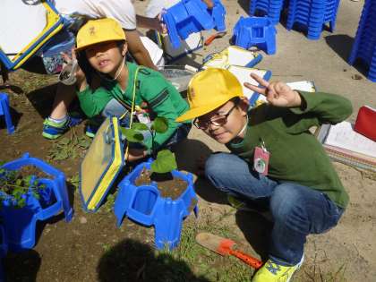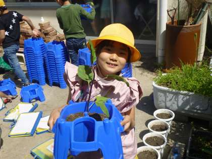 なす、ピーマン、トマトなどの野菜の苗を各自の容器に植え替えました。