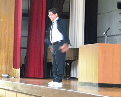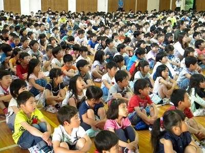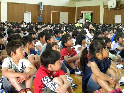 <校長が児童の前で、10秒間、腕(羽と見立てて)を羽ばたかせてみました。>