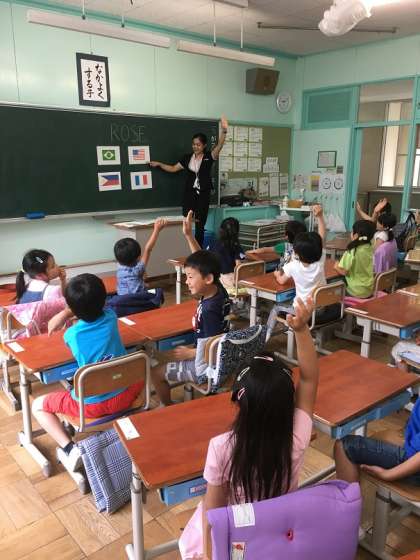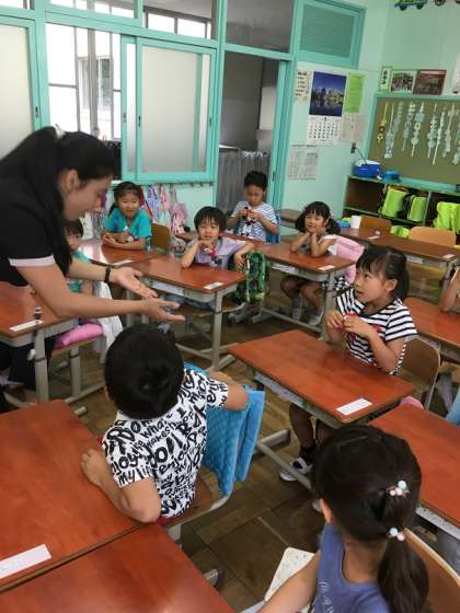 初めての英語の授業に、みんなドキドキわくわくです。自分の好きな色や果物など、がんばって発表していました。