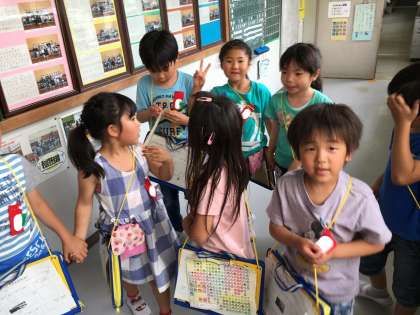 地図を見ながら、グループで校内を探検している1年生に出会いました。