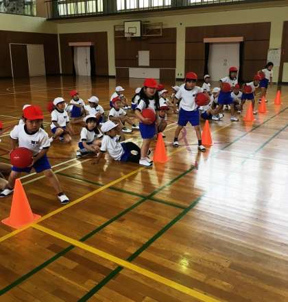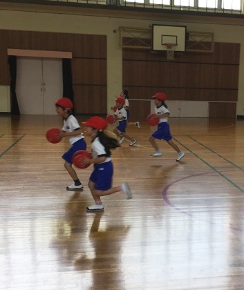 体育館でバトンの代わりにボールを使って,チームでリレーをしました。笛の合図でスタートをします。みんな真剣な表情をしていました。ボールを落とさないように,お友達に上手に渡していました。
