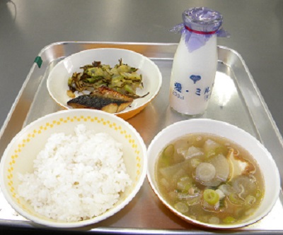 今日の「根菜汁」はごぼう、大根、にんじん、さつまいもと、土の中で育つ野菜がたくさん入った和風の汁ものです。便秘の予防になる食物繊維が多いメニューです。