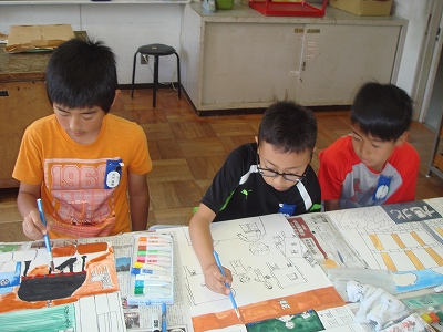 校舎や運動場の絵を描いて、色を塗りました。