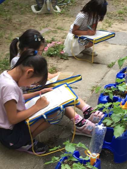 アサガオの観察では,葉っぱの数や大きさ,つるがのびてきた様子など観察しました。目で見るだけでなく,さわった感じも書きとめました。