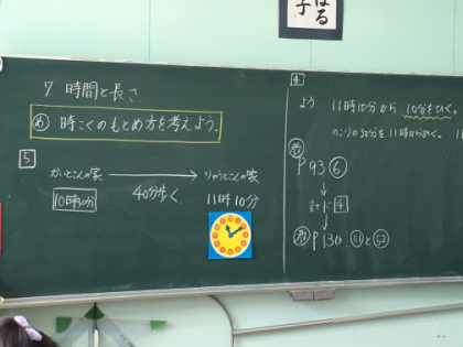 担任のT先生は、図式化したり、時計の模型を使ったりと工夫していました。