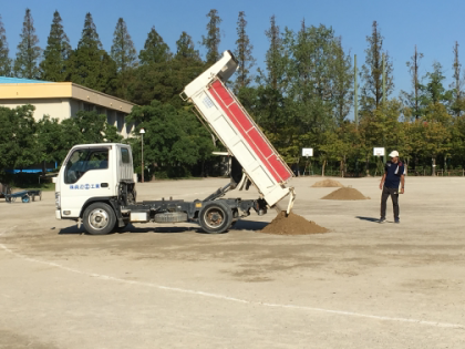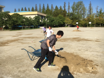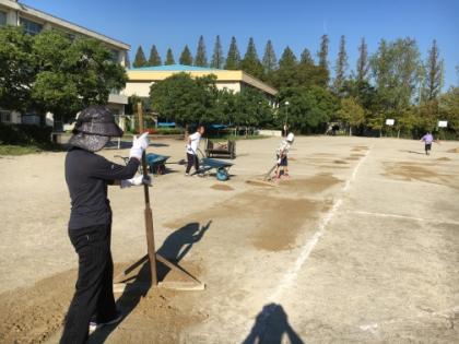 子供たちが少しでも安全に走りやすいように、グランドの凹み部分に土を入れて固めました。