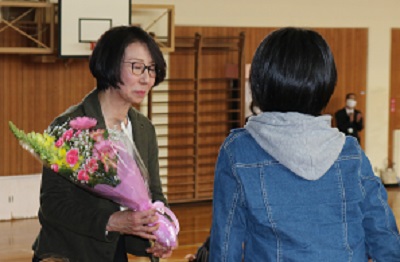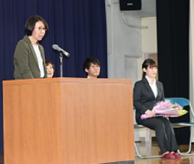 職員室で、事務の仕事を4年間していました。皆さんとかかわることは少なかったですが、皆さんの声が聞こえてくると、嬉しく思いました。今の学校でも、子どもたちの元気な姿を見て、新しい仕事をがんばろうと思っています。皆さん、勉強に運動に、がんばってください。ありがとうございました。