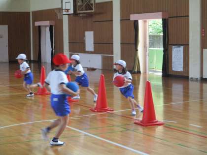 1年生の体育です。体育館で、チームに分かれてリレー遊びをしていました。走る動きの学習でもあり、チームでパスをしていく遊びを学ぶ学習でもあります。先生の話をとてもよく聞くことができるので、すぐにスムーズに活動できていました。