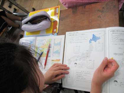 5年生の社会科です。同じ日本でも、地域によってずいぶんと違いますが、気温、雨量や積雪などの観点から、日本列島をとらえる学習をしていました。教科書の資料を使って、白地図で視覚的にわかりやすくまとめていました。
