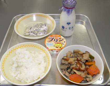 今日は筑前煮とサバの銀紙焼き。サバの銀紙焼きは、昔から給食の定番ですが、配膳している最中から教室中に独特の香りが漂います。筑前煮は、根菜がたっぷり入っていて、栄養たっぷりです。子どもたちにとっては、きっと、豆乳プリンがうれしいですね。