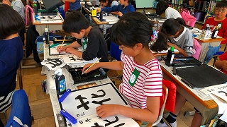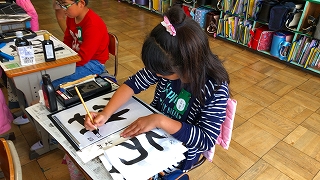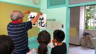 「花」という字の清書をかきました。一筆ずつポイントを意識しながら,丁寧にかいていました。力強く立派な字がかけています。先生と一緒に,提出する作品を真剣に選んでいました。