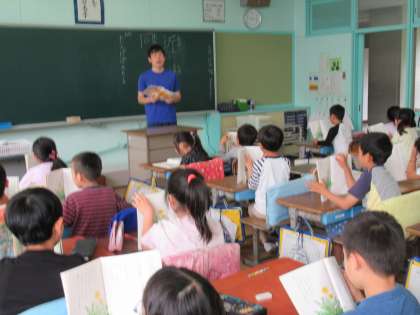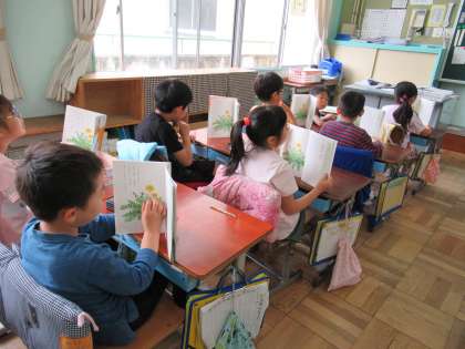 2年生の国語です。「たんぽぽのちえ」という文章を読んでいました。これは説明的文章で、文章の組み立て、表現の工夫などの学習へとつなげていきます。繰り返し音読することで、論理的な文章の展開の仕方が自然に身についていきます。