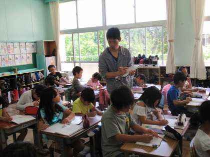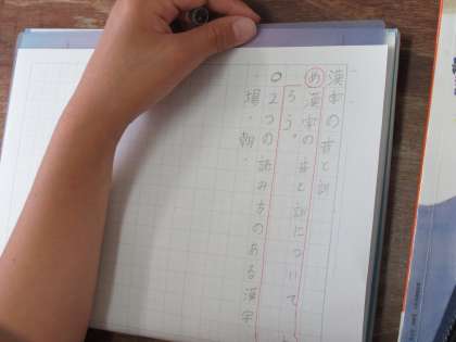 3年生の国語です。漢字の、音読み、訓読みについての学習をしていました。たとえば、朝は「ちょう」と「あさ」ですね。まずは、知っている漢字で二通りの読み方があるものをそれぞれ思い起こし、ノートに書いていました。漢字の由来についても教えてもらいながら、さまざまな漢字の音読みと訓読みについて学んでいきます。