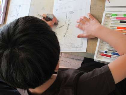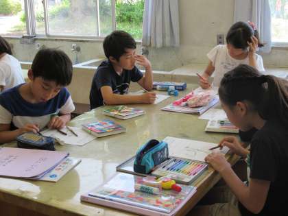 4年生の図工です。クリムトの「人生は戦いなり」の絵を鑑賞していました。まず、絵から感じ取ったことを、自分なりの言葉で発表しました。そして、この絵を、自分だったらどのような色にし、どのような題をつけるか考え、自分の感性を生かしてワークシートに描いていました。