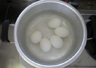 時間を計って、穴じゃくしで、卵を引き上げて、冷やしました。